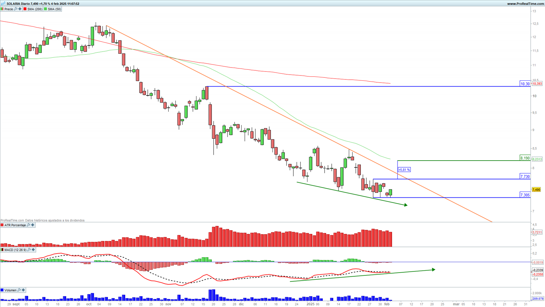 En el gráfico diario de Solaria (SLR),podemos observar que, el activo bajo estudio se encuentra desarrollando divergencias alcistas, siendo esta una señal adelantada de un posible rebote en el activo. En este sentido, el precio desarrolla mínimos decrecientes, los cuales vienen acompañados de mínimos crecientes en el oscilador MACD. De este modo, vigilamos la lateralidad que se está completando en las últimas sesiones comprendida entre los 7,305 y los 7,73€ por acción, de modo que, si asistimos a la superación de los 7,73€ por acción, trabajaremos en base a un rebote en las acciones de Solaria, con una proyección de ascenso mínimo teórica de un 5,80% aproximadamente, en el entorno de los 8,19€ por acción.