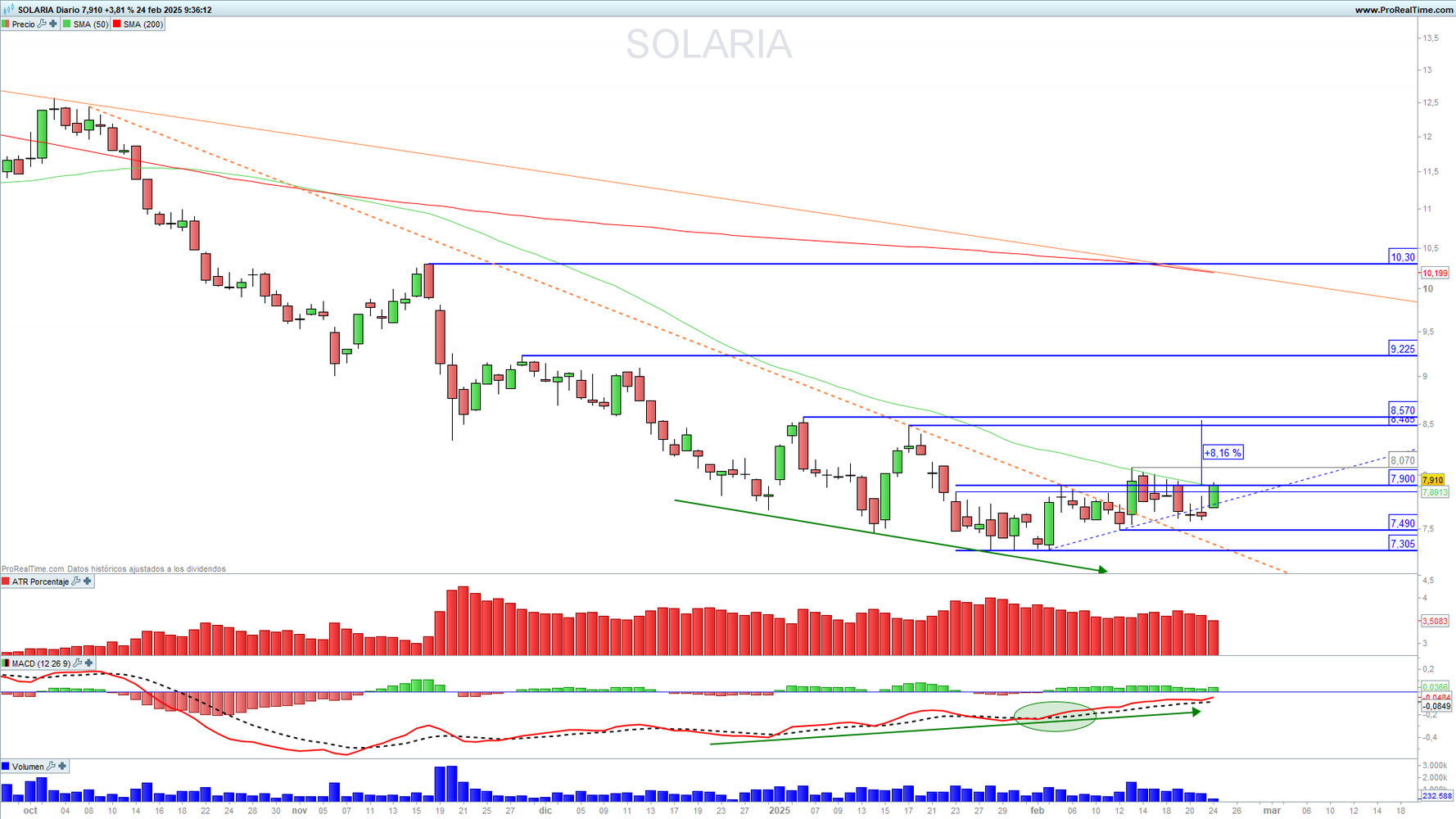 Solaria (SLR) en escala diaria con volatilidad (gráfico central superior), MACD (gráfico central inferior) y actividad de contratación (ventana inferior). Fuente: ProRealTime y