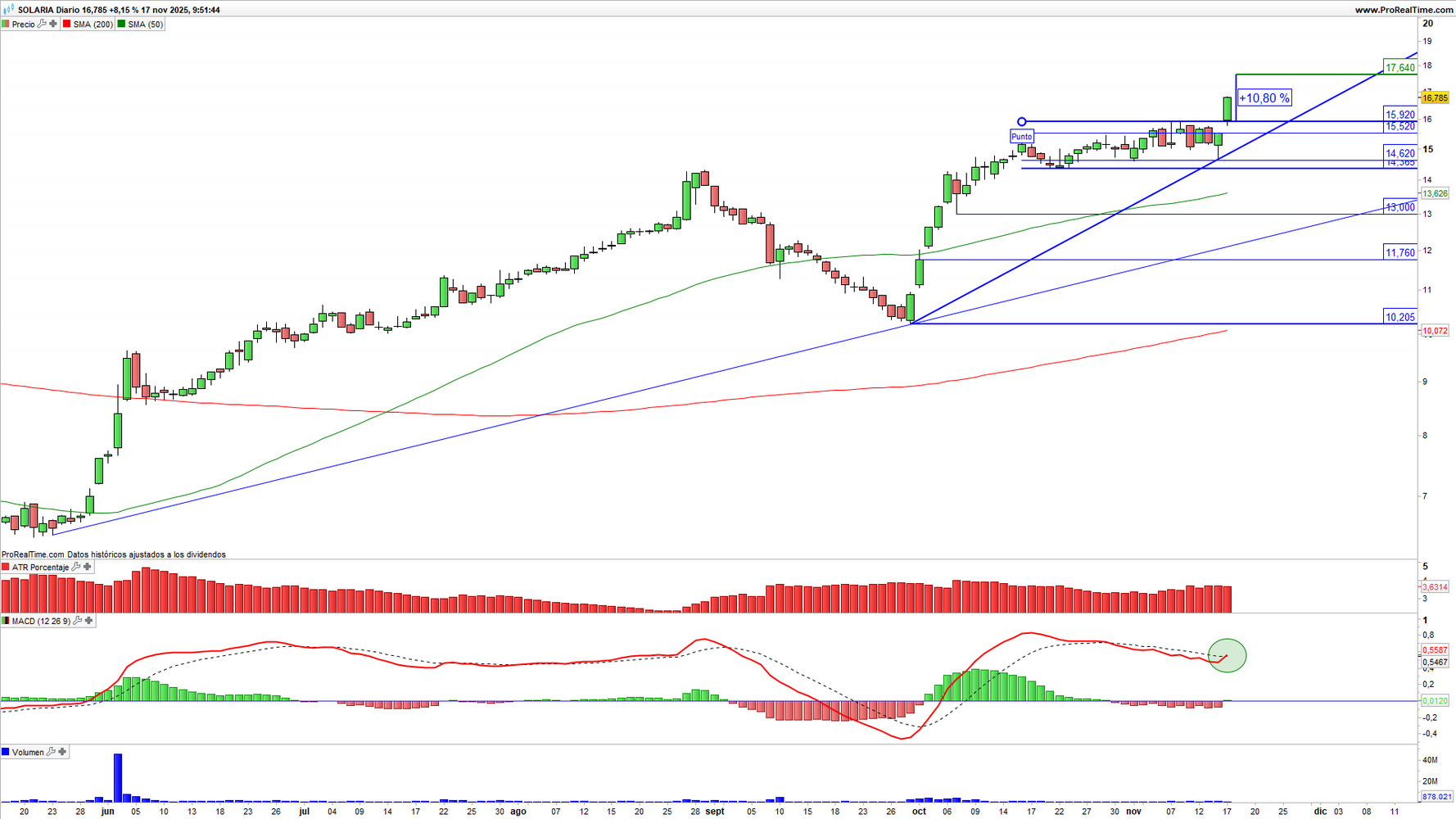 En el gráfico diario de Solaria (SLR), observamos que el precio arranca la semana con un Gap o hueco alcista registrando alzas superiores al 8%. Además, el oscilador MACD vuelve a producir la activación de cortes ascendentes reforzando con ello el movimiento de las compras en el activo. De este modo, el precio registra con claridad la ruptura al alza de un rango lateral comprendido entre los 14,36 y los 15,92€ por acción, por lo que la continuidad alcista se antoja como el escenario de mayor probabilidad pudiendo llevar al precio a atacar las inmediaciones de los 17,64€ por acción, por lo que mantendremos la actitud muy positiva para las acciones de Solaria durante las próximas sesiones.
