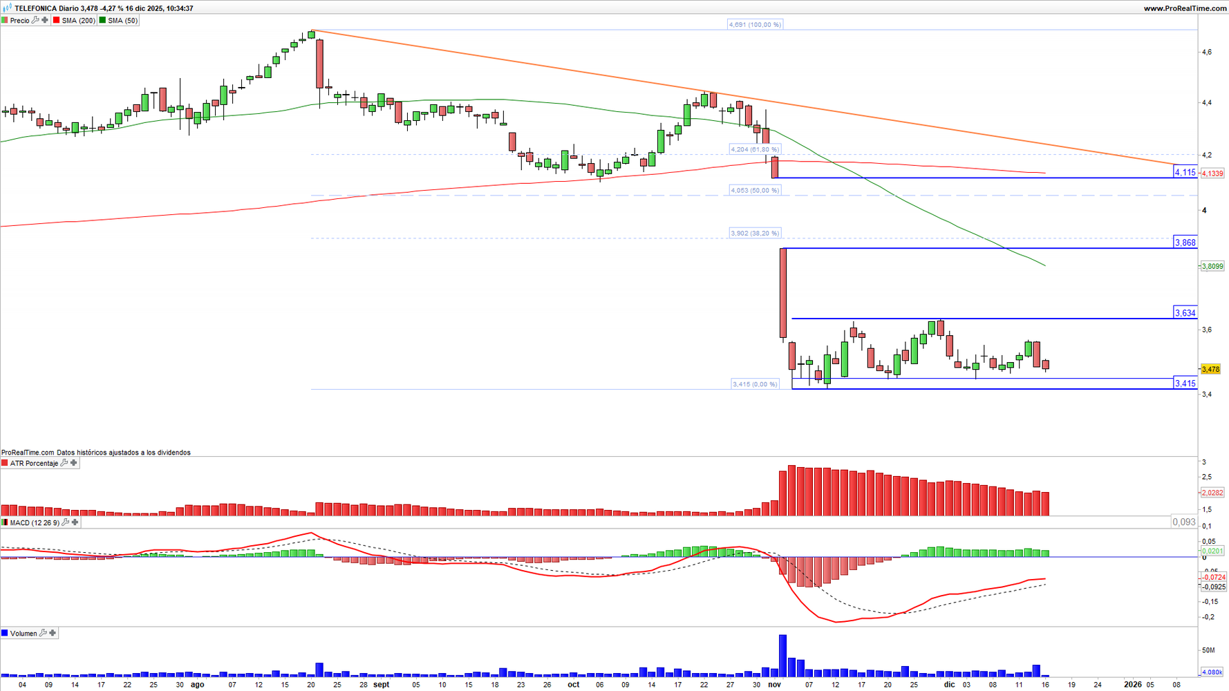 La cotización de Telefónica se encuentra descontando el segundo dividendo del año que se llevará a cabo el próximo jueves. En este sentido, las caídas de la jornada de hoy representan el descuento del dividendo que se repartirá, por lo que los niveles a tener en cuenta para las próximas sesiones se actualizan tras el reparto de dividendos.