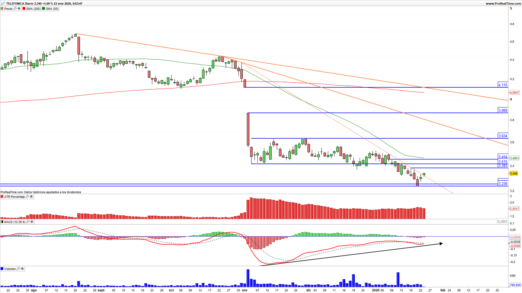 Telefónica (TEF) en escala diaria con volatilidad (gráfico central superior), MACD (gráfico central inferior) y actividad de contratación (ventana inferior). Fuente: ProRealTime y elaboración propia.