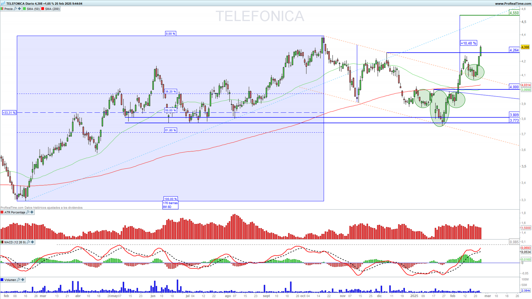 Telefónica (TEF) en escala diaria con volatilidad (gráfico central superior), MACD (gráfico central inferior) y actividad de contratación (ventana inferior). Fuente: ProRealTime y