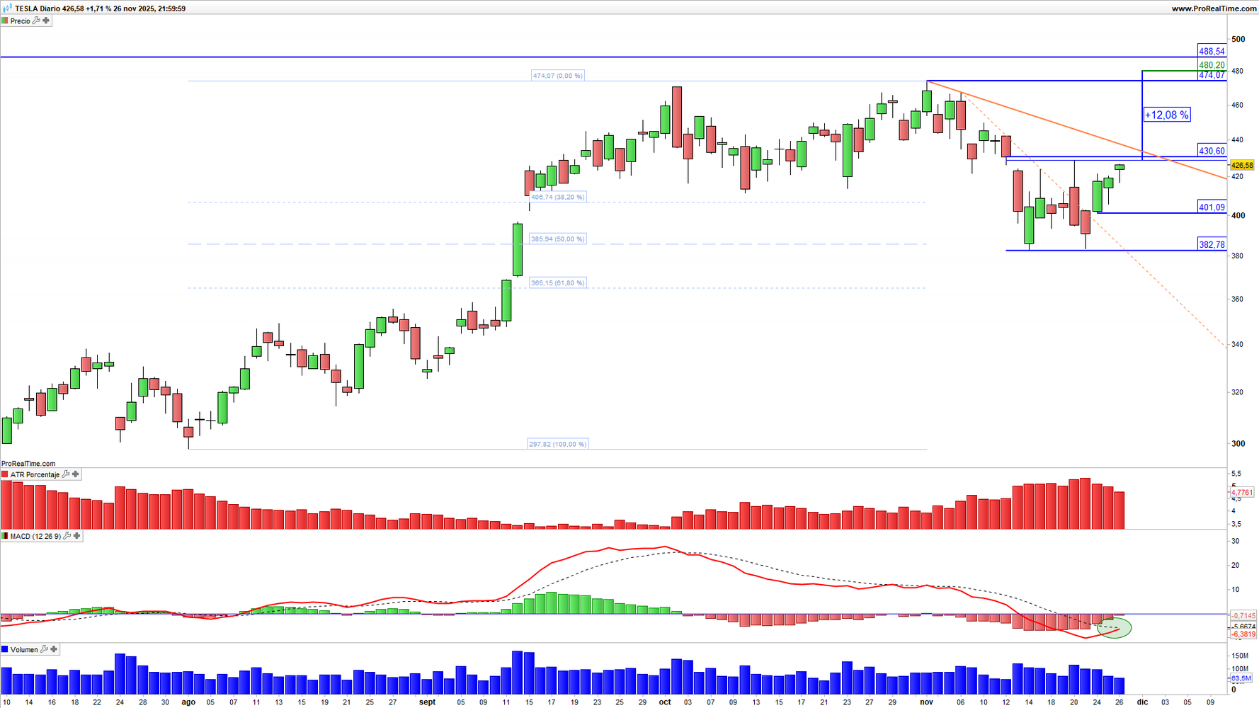 Tesla (TSLA) en escala diaria con volatilidad (gráfico central superior), MACD (gráfico central inferior) y actividad de contratación (ventana inferior). Fuente: ProRealTime y elaboración propia.
