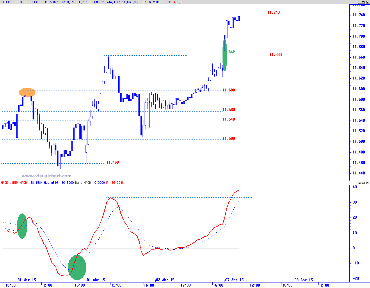 IBEX 35 en gráfico de 15 minutos con oscilador MACD