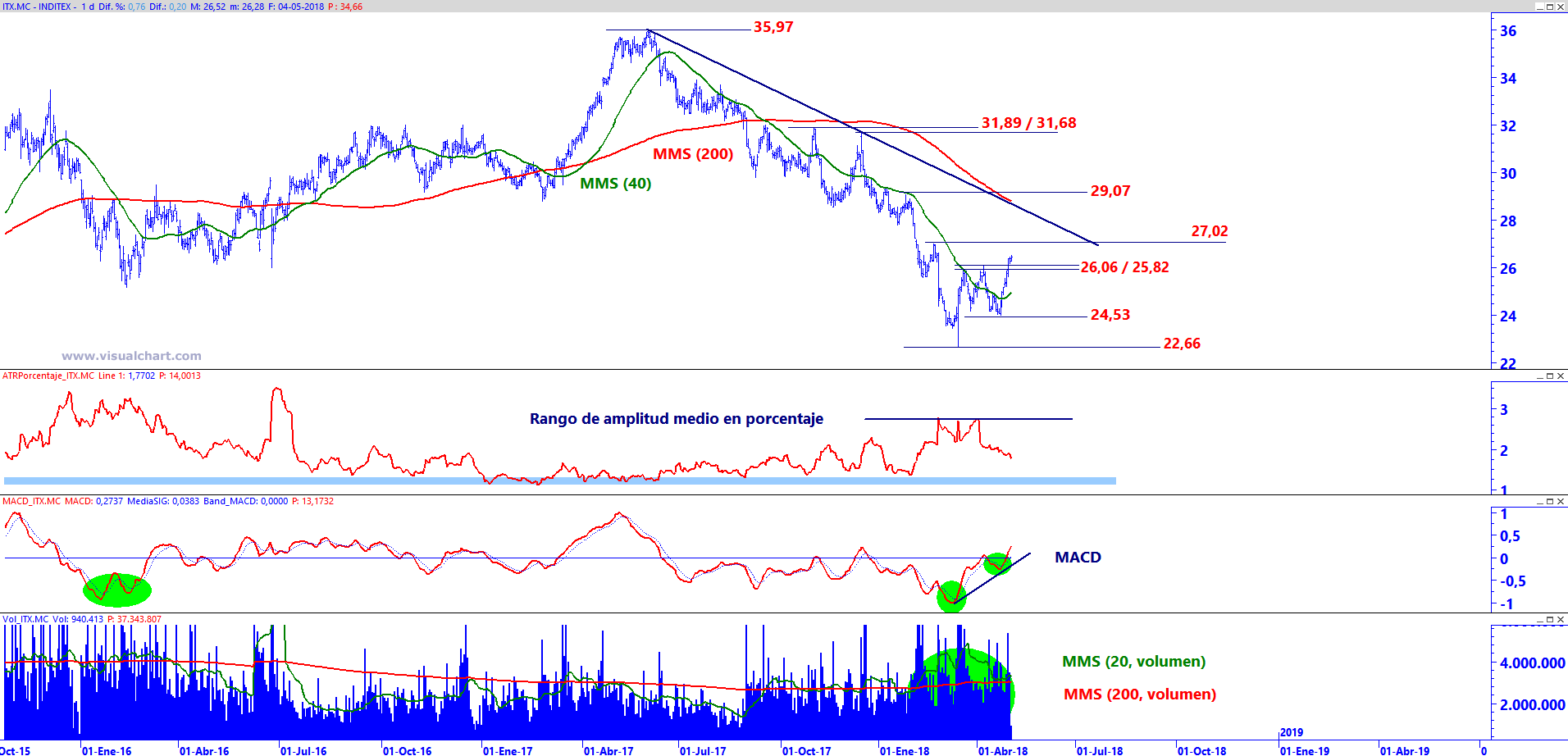 Inditex en gráfico diario con Rango de amplitud medio en porcentaje (ventana central superior), MACD (ventana central inferior) y volumen de contratación (ventana inferior)