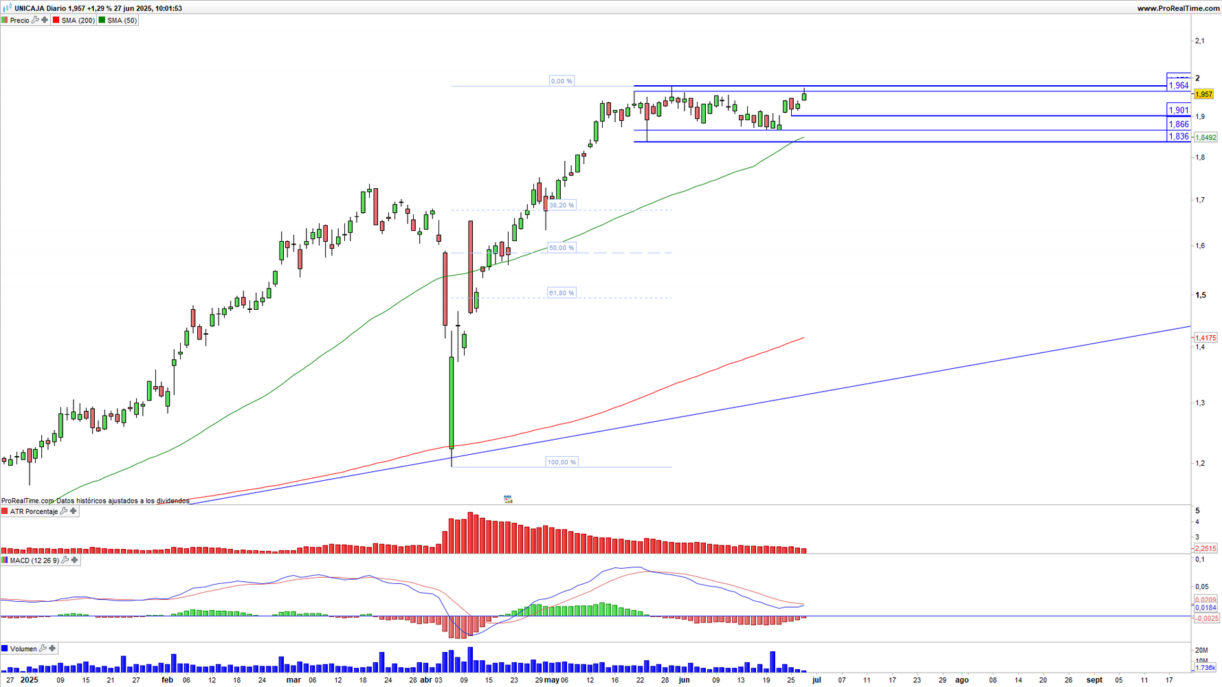 Unicaja (UNI) en escala diaria con volatilidad (gráfico central superior), MACD (gráfico central inferior) y actividad de contratación (ventana inferior). Fuente: ProRealTime y elaboración propia.
