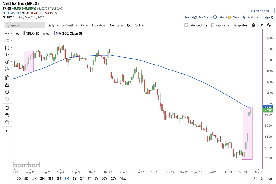 Netflix lleva cinco días consecutivos cotizando en verde, su racha alcista más larga desde agosto, y está a punto de superar su media móvil de 100 días por primera vez desde octubre
