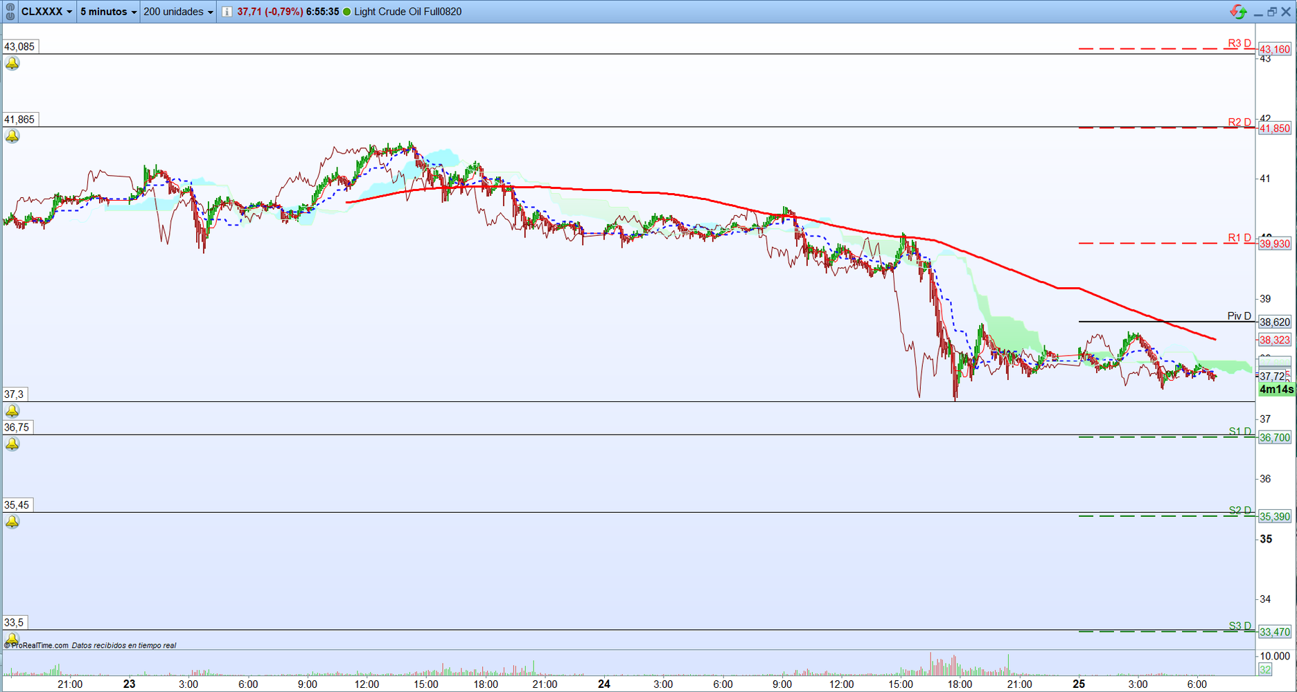Futuro del Petróleo: ¿Qué zonas son operables hoy en el CP?Mónica Triana García / Carlos Gil Barceló. Analistas de tradingEl Futuro del petróleo en estos momentos está cotizando en 37,72. Si el precio iniciara un movimiento bajista y perdiera 37,30 y nos quedara espacio suficiente antes de S1 situado en 36,70 podríamos valorar un corto considerando un objetivo reducido del orden de 10 a 15 puntos. Si se perdiera S1 podríamos volver a valorar un corto, considerado un objetivo superior del orden de 20 a 25 puntos hasta aproximarnos a S2 en 35,39 que podría actuar como soporte. Si se perdiera también S2, podríamos volver a valorar un corto considerando un objetivo del orden de 30 a 40 puntos antes de aproximarnos a S3 situado en 33,47.