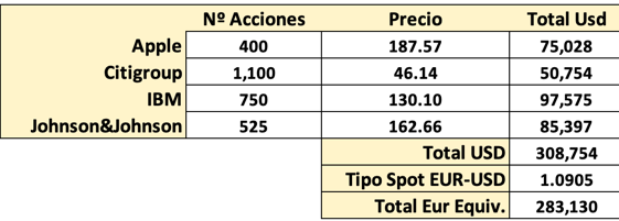 El riesgo del cliente está en que el euro se aprecie con respecto al USD, erosionando cualquier rentabilidad positiva que haya obtenido en la posición tomada en las acciones americanas. Ante una apreciación del EUR-USD, a 1.1220 por ejemplo, el nuevo valor en euros de la cartera sería, manteniendo los precios de las acciones iguales: