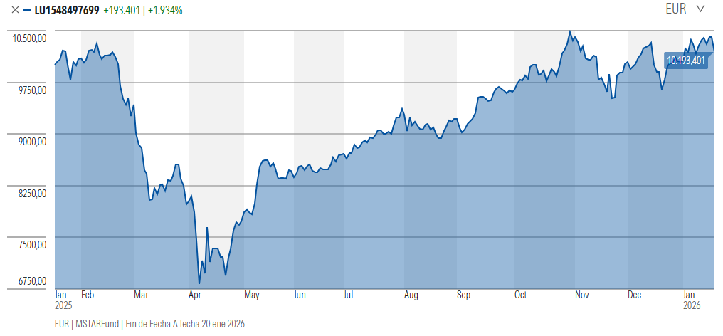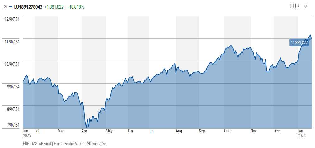 El fondo invierte tanto en compañías que desarrollan IA, robótica o semiconductores como en empresas de defensa, seguridad o salud que ya están incorporando estas tecnologías en la economía real. Este enfoque permite capturar el crecimiento estructural de la IA desde múltiples ángulos, especialmente en áreas donde existen cuellos de botella y fuertes necesidades de inversión en infraestructuras críticas. Además, su diversificación sectorial y geográfica reduce la dependencia de un único motor de rentabilidad. A ello se suma un sólido comportamiento reciente, con una rentabilidad cercana al 21% en el último año y más del 60% a tres años, coherente con su perfil temático.