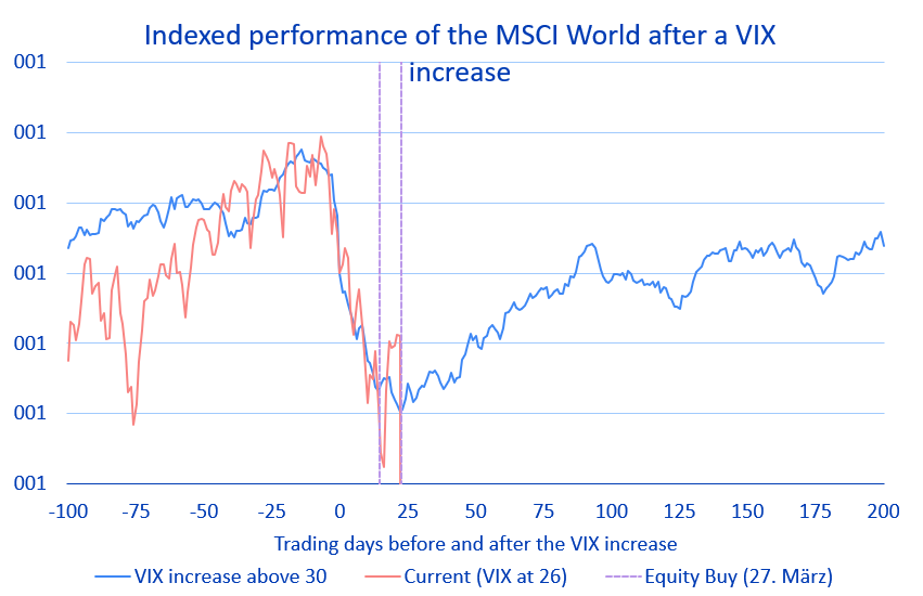 Gracias a las compras de acciones del 27 de marzo, entramos en abril con una sobreponderación del 3% en renta variable que ahora está empezando a dar sus frutos. Incluso las acciones de materiales básicos, que inicialmente fueron fuertemente penalizadas, se han recuperado significativamente y se encuentran entre las ganadoras de las últimas semanas. Un factor clave ha sido la fuerte recuperación del precio del oro desde 4.100 USD hasta 4.800 USD; mantener la posición sobreponderada aquí también ha demostrado ser beneficioso. El aumento de la duración a finales de marzo y la reducción de la posición en dólares estadounidenses también han sido buenas decisiones hasta ahora.