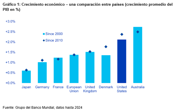 La posición económica única que Estados Unidos ha mantenido durante las últimas décadas, creemos que ejemplifica esta teoría. Durante este periodo, la innovación en Estados Unidos ha estado a menudo en la frontera tecnológica, respaldada por un sólido sistema universitario, estrechos vínculos entre el mundo académico y la industria, y un entorno empresarial propicio para la experimentación y la escalabilidad.