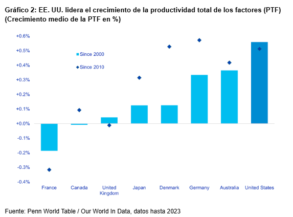 Como resultado, las ganancias de productividad –medidas por un mayor crecimiento de la productividad total de los factores (PTF) es decir, la parte del crecimiento económico impulsada por el progreso tecnológico, la innovación y las mejoras en la eficiencia– han desempeñado un papel clave en el impulso del crecimiento económico en los EE. UU. en comparación con otras economías desarrolladas (ver gráficos arriba y abajo).