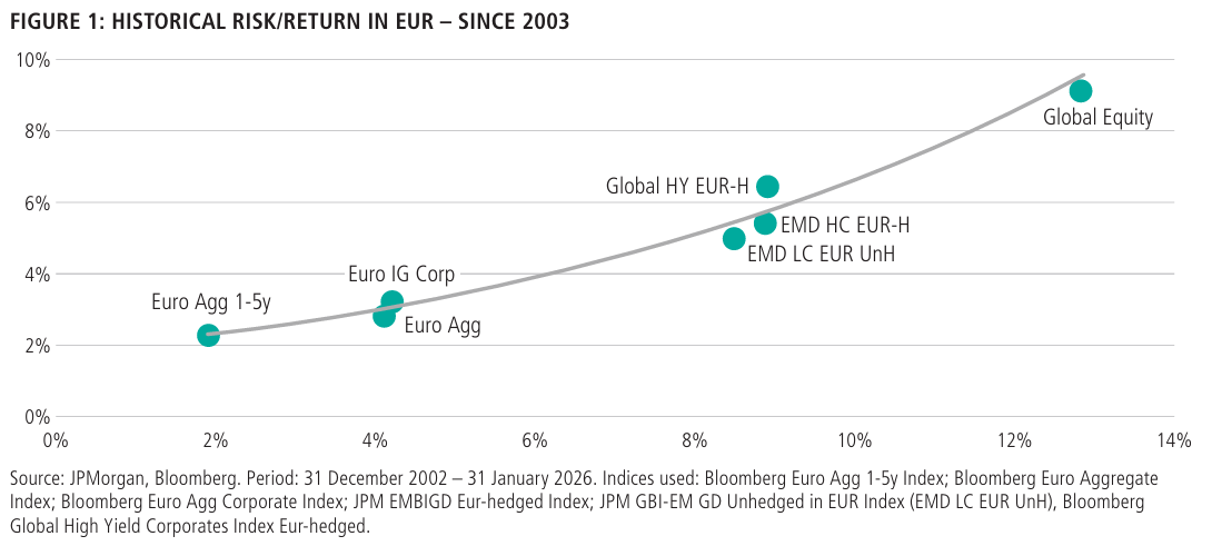 Desde la perspectiva del euro como moneda de referencia, la deuda de mercados emergentes en moneda local (EMD LC) ha ofrecido históricamente un perfil de riesgo-rentabilidad situado entre la renta fija en euros y la renta variable global. Las rentabilidades a largo plazo en euros (2003-2025) han rondado el 5% anual, con una volatilidad significativamente menor que la de la renta variable global y ligeramente inferior a la de un índice típico de divisas fuertes de mercados emergentes cubierto frente al euro y a la de los bonos de alto rendimiento globales.