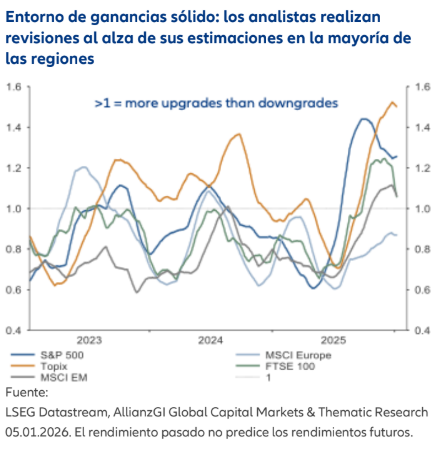 Para los inversores, este panorama macroeconómico puede sentar las bases para un crecimiento positivo de los beneficios empresariales y para la posibilidad de obtener primas de riesgo también durante el próximo año. En los últimos años, los inversores han tenido que lidiar con un mayor grado de incertidumbre. Si bien persisten los riesgos políticos elevados, hay motivos para creer que parte de la incertidumbre en torno a la política comercial, los aranceles y las tensiones geopolíticas podría disminuir gradualmente, aunque la reciente intervención de Estados Unidos en Venezuela parezca apuntar en la dirección contraria. Aparte de las midterms en Estados Unidos el 6 de noviembre de 2026, no hay previstas elecciones nacionales importantes en las principales economías industrializadas. En Europa, sin embargo, varias elecciones a los parlamentos regionales alemanes podrían atraer cierta atención.