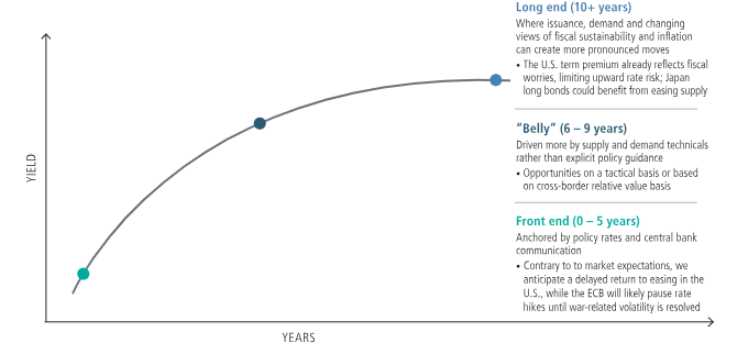 Para ilustrar algunas de estas diferencias, hay que tener en cuenta que los cambios en las políticas, la inflación y las tendencias de crecimiento pueden ofrecer nuevas oportunidades diferenciales en los tipos de interés de los distintos mercados. En EE. UU., aunque los mercados contemplan ahora una posible subida de tipos este año vinculada a los precios de la energía, creemos que una economía potencialmente más débil y un mercado laboral frágil podrían acabar dando lugar a nuevos recortes; mientras tanto, los rendimientos de los bonos del Tesoro a largo plazo reflejan en gran medida las preocupaciones actuales sobre la sostenibilidad de la deuda, lo que probablemente limite el riesgo de duración. En Europa, el lento crecimiento y la falta de confianza, combinados con la volatilidad vinculada al conflicto de Oriente Medio, podrían mantener los tipos de interés oficiales en los niveles actuales, a pesar de las expectativas del mercado de que se produzcan subidas; los cambios en los perfiles de crecimiento y deuda en toda Europa favorecen las operaciones de valor relativo. Japón se ha alejado de la política monetaria ultra expansiva y la curva de tipos se ha empinado considerablemente. Dada la posible reducción de la oferta en el extremo largo y los atractivos rendimientos cubiertos, pueden existir oportunidades en el extremo largo de la curva japonesa.
