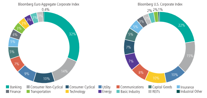 Ampliar la exposición crediticia por zonas geográficas puede ayudar a lograr mayores oportunidades de alfa, simplemente al ampliar el universo de empresas diferentes disponibles para la inversión (véase el gráfico). El universo empresarial europeo, por ejemplo, tiene menos exposición a la tecnología que el estadounidense (3 % frente a 10 %), incluida la IA, lo que podría suponer un factor de diversificación si el sector de la IA sufre un revés en EE. UU. Dicho esto, algunos emisores no estadounidenses están posicionados en el desarrollo de la IA a través de infraestructuras, semiconductores y otros facilitadores, ofreciendo una combinación equilibrada de proveedores, facilitadores y usuarios.
