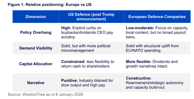 Los comentarios y las órdenes ejecutivas del presidente de Estados Unidos, Trump, están dirigidos de lleno a la asignación de capital y a los márgenes de los grandes contratistas de defensa estadounidenses. Como resultado, la lectura directa es más negativa para las acciones de defensa de EE. UU. que para las empresas europeas del sector.