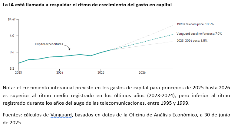 En el último año, el gasto en inversión en general se ha más que duplicado con respecto al ritmo anterior, lo que ha supuesto un importante respaldo para la economía en un contexto de gran incertidumbre. En particular, el gasto relacionado con el desarrollo de la inteligencia artificial ha experimentado un aumento que esperamos que continúe. Estimamos que, durante el próximo año, el gasto en inteligencia artificial proporcionará otros 450.000 millones de dólares en inversiones, lo que respaldará un crecimiento general de la inversión no residencial del 7%.