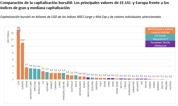 Actualmente, Novo Nordisk, el mayor valor entre los GRANOLAS, tiene el mismo valor de mercado que Tesla, el más pequeño de los “Siete Magníficos”. Aunque eso no quiere decir que debamos restarle importancia al tamaño de estas empresas. De hecho, las acciones de Novo Nordisk valen actualmente más que el PIB en 2023 de su mercado de origen, Dinamarca. Esta comparación pone de relieve la diferencia de escala entre las megacapitalizaciones europeas y estadounidenses. En una cartera de renta variable ponderada por la capitalización bursátil mundial, esto se traduce en una asignación de menos del 5% a GRANOLAS, frente a aproximadamente un 25% a los “Siete Magníficos”.