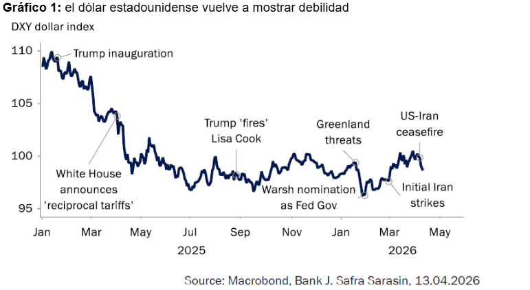 El anuncio del alto el fuego entre EE.UU. e Irán ha provocado un debilitamiento del dólar estadounidense, revirtiendo una parte significativa de las ganancias acumuladas desde el inicio de la guerra. El EUR/USD ha subido aproximadamente un 1,5% desde que el alto al fuego se hizo público, mientras que el índice DXY (que mide el valor del dólar estadounidense frente a una cesta de seis monedas principales) ha vuelto a situarse por debajo del nivel de 100 (Gráfico 1). Aun así, una comparación entre la evolución del dólar en marzo y principios de abril con los movimientos registrados en 2025 muestra que las fluctuaciones recientes han estado relativamente contenidas.
