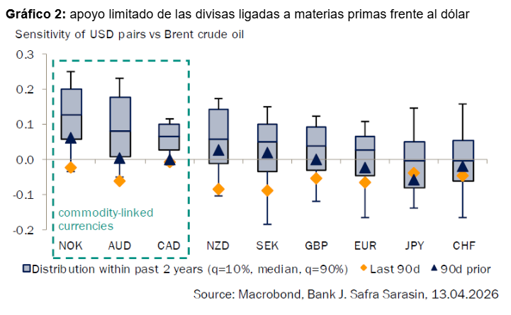 Es probable que el dólar estadounidense alcanzara su máximo en marzo y que, a partir de ahora, se debilite, salvo que se produzca una reescalada militar significativa entre Irán y EE.UU., algo que consideramos poco probable. Ambas partes tienen incentivos claros para la desescalada. Un acuerdo formal o el colapso del régimen iraní serían los escenarios más negativos para el dólar. Por el contrario, una reescalada y prolongación del conflicto probablemente provocarían un rebote del dólar, penalizando a las divisas cíclicas, especialmente a las de economías importadoras netas de energía. El franco suizo y el yen japonés están particularmente bien posicionados para beneficiarse de una moderación en las expectativas de subidas de tipos.