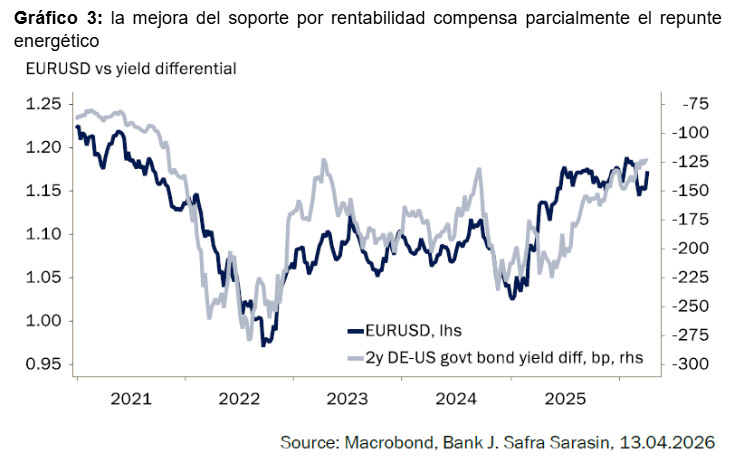 Como señalamos anteriormente, la dinámica de las divisas reflejó en gran medida el repunte de los precios de la energía al inicio del conflicto, dejando en peor posición a las monedas de economías importadoras netas de energía, mientras que las de economías exportadoras netas resistieron mejor. Sin embargo, el estatus del dólar como activo refugio probablemente explica por qué ha superado a todas las demás divisas del G10, incluso a las de grandes economías exportadoras de petróleo (Gráfico 2). En los últimos días, el mercado ha vuelto a centrar su atención en los tipos de interés, lo que ha permitido al euro comportarse notablemente mejor frente al dólar de lo que cabría esperar únicamente por el repunte de los precios energéticos (Gráfico 3). Esto también se aplica a la libra esterlina y al yen.
