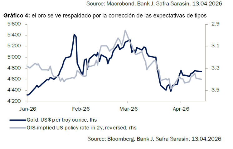 Reiteramos nuestra visión positiva sobre el oro en todos los escenarios. Un acuerdo entre EE.UU. e Irán que implique la reapertura del estrecho de Ormuz al tráfico sería probablemente el escenario más alcista para el oro, aunque el metal precioso también debería subir si el presidente Trump decide retirarse sin acuerdo. Junto con la corrección de las expectativas de tipos desde los máximos de marzo —que ha permitido al oro recuperarse en los últimos días (Gráfico 4)—, ambos escenarios tendrían un efecto negativo a largo plazo sobre la influencia global de EE.UU., reforzando la demanda estructural de oro como activo de reserva alternativo al dólar. Por el contrario, una reanudación de las hostilidades con precios energéticos elevados mantendría al oro volátil a corto plazo, aunque su apoyo mejoraría cuando el mercado centre su atención en las consecuencias económicas.