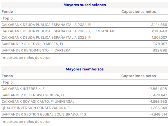 Como era de esperar, con Caixa liderando en las captaciones netas, son sus fondos de deuda pública italiana los que más captaron, seguido de dos fondos del Santander, Objetivo 19 meses y el rendimiento. Mientras que en la otra cara de la moneda, el Caixabank Intereses casi ronda los 3.000 millones de salidas netas, con el Santander Defensivo y el Santander Gestión Global Equilibrada con salidas superiores a los 1.200 millones: