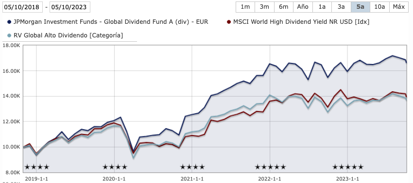 - Empecemos con un fondo que nos justa mucho. Se trata del JPMorgan Global Dividend Fund (LU0714179727), con un patrimonio que supera los 3.000 millones de dólares, y a 5 años alcanza el máximo rating de Morningstar. El fondo tiene una volatilidad del 13,42%, una ratio de Sharpe de 1,03 y una rentabilidad media a 3 años del 15,29%. Este año gana un 5,76% al cierre de septiembre, mientras que en 2022, con toda la caída de los mercados, solo cayó -3,63%. Consistentemente se posiciona en el primer cuartil por rentabilidad, lo que es muestra de un proceso de inversión bien definido y consistente, que es aplicado por su gestor Sam Witherow (rating A por Citywire), co-gestionado por Helge Skibeli, también A por Citywire, a quienes se ha unido en febrero de este año Michael Rossi.