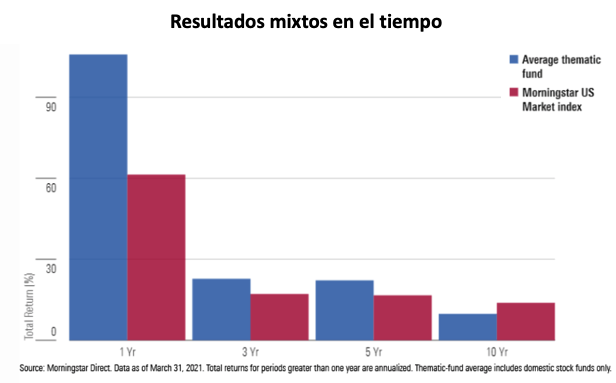 Durante los últimos 10 años, la rentabilidad de los fondos temáticos (que son una versión más estrecha de los fondos sectoriales) se han quedado retrasadas respecto a los rendimientos del mercado en general en aproximadamente 4 puntos porcentuales en promedio por año.