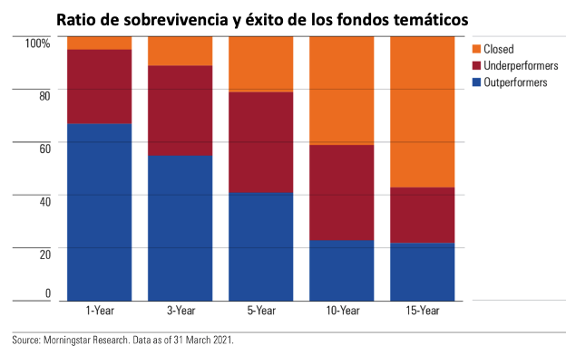 Según el reporte anual de Morningstar de fondos temáticos, aproximadamente el 30% de los fondos temáticos domiciliados en EE.UU. lanzados en las pasadas tres décadas ya no están más en el mercado, y esa tasa de “mortalidad” es aún mayor para aquellos fondos lanzados en mercados fuera de EE.UU.