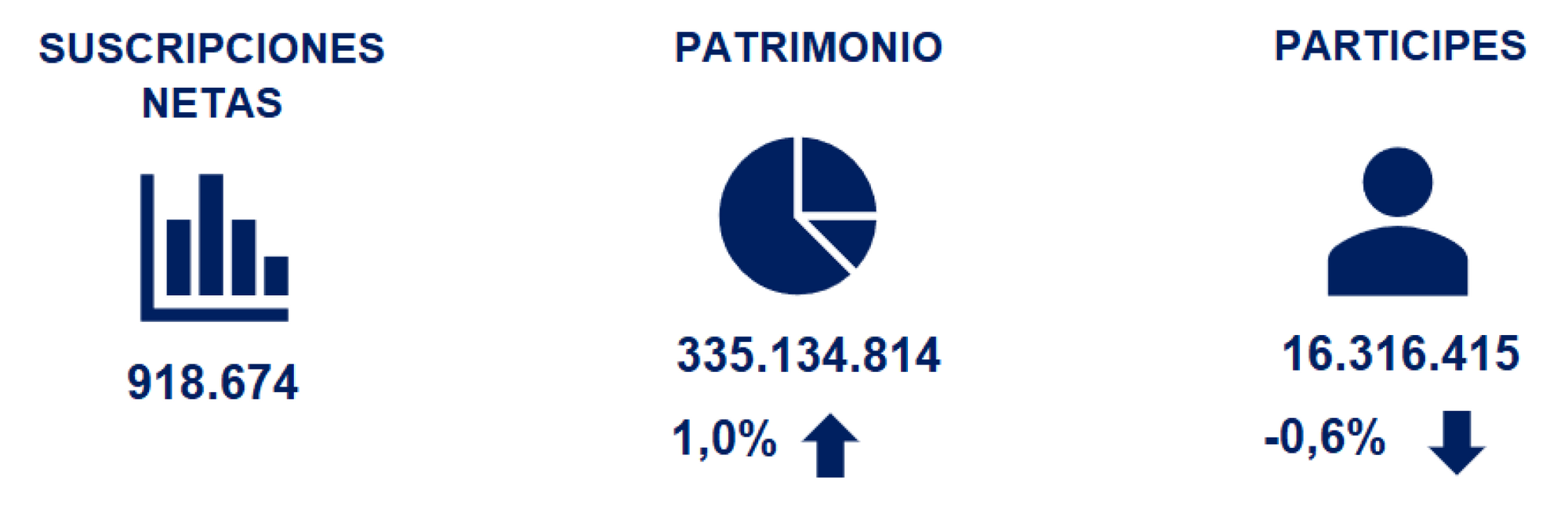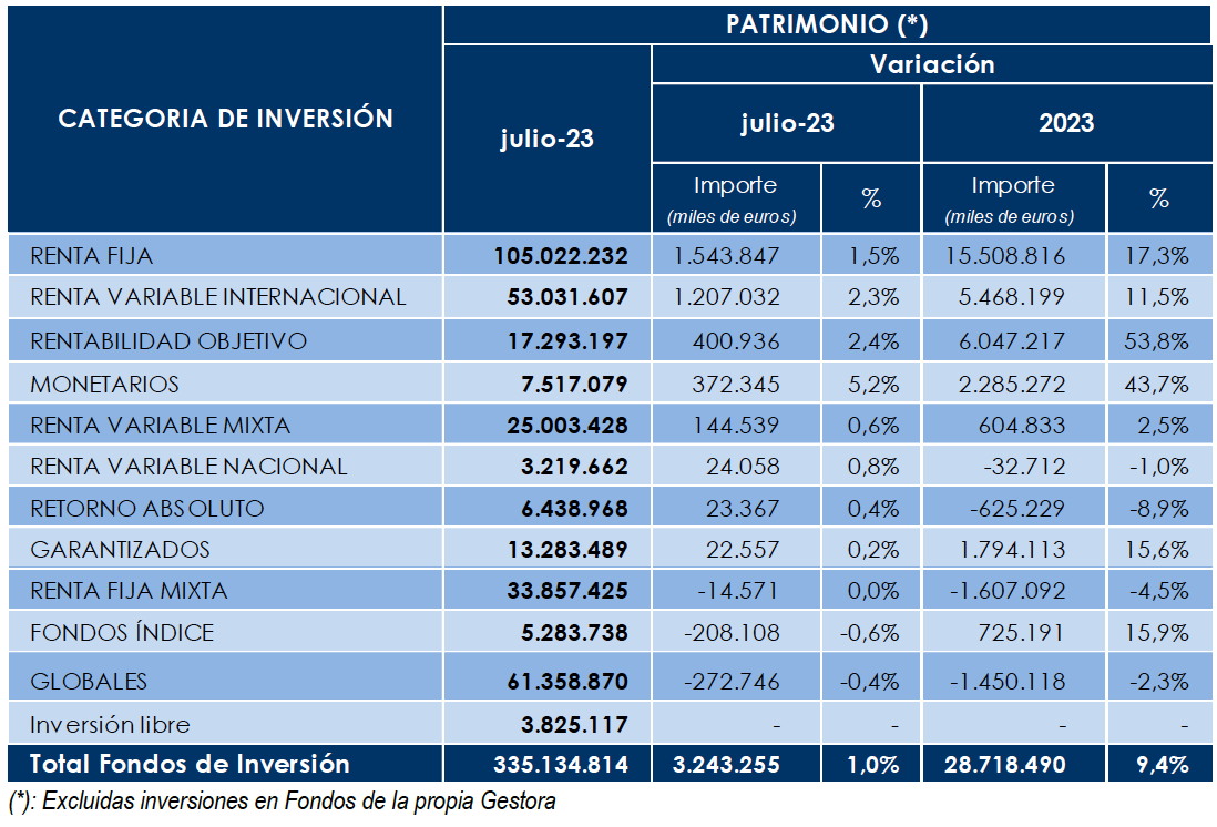 Es por ello, que el patrimonio de los fondos de inversión en España alcanzó los 335.135 millones de euros, un 1% más que en junio pero en donde los mercados explican el 71,3% de los 29.000 millones en que aumenta el patrimonio en julio, el resto es debido a captaciones netas que ascendieron a 919 millones de euros, marcando así 33 meses consecutivos de suscripciones netas positivas.