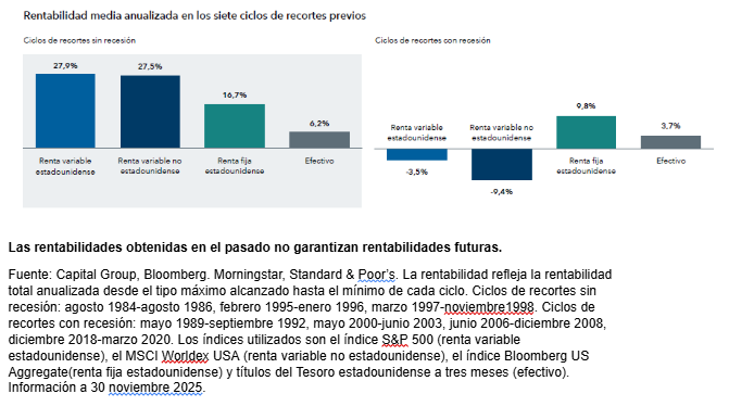 Se estima que los tipos de interés estadounidenses cierren 2026 cerca del 3%, un nivel que, según Atluri, ni restringe ni estimula el crecimiento económico. Estos tipos influyen en los costes de financiación a escala mundial, y unos niveles más bajos de tipos de interés podrían respaldar el consumo. Históricamente, los ciclos de recortes de tipos de la Reserva Federal que han tenido lugar fuera del marco de una recesión han impulsado tanto a los mercados de renta fija como a los de renta variable, que han superado al efectivo.