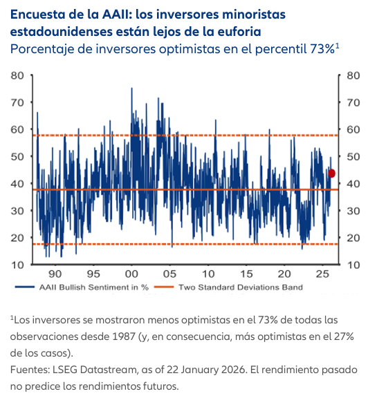 Dicho esto, la vulnerabilidad del mercado a las correcciones está aumentando, aunque solo sea porque el optimismo y la exposición son mayores que hace solo unas semanas. Aun así, hay pocos indicios de euforia desenfrenada y la última prueba de resistencia política ha demostrado que los mercados siguen siendo lo suficientemente resistentes como para absorber los reveses. En un contexto de elevadas expectativas y persistente incertidumbre geopolítica, lo más aconsejable para los inversores es mantener un enfoque disciplinado y diversificado.