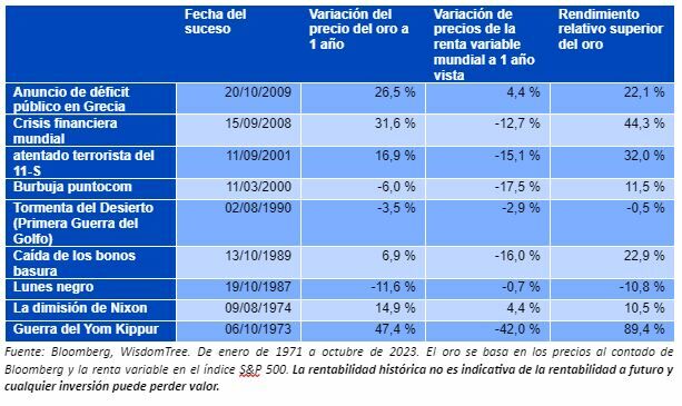 Nuestro análisis muestra que cuando el Índice de Riesgo Geopolítico (GPR) ha subido 1 desviación típica por encima de su media histórica (lo que indica un aumento de la tensión geopolítica), el oro ha subido un 9% interanual de media, mientras que el índice bursátil S&P 500 ha caído un 8,6% interanual en esos meses. El Gráfico 1 muestra el comportamiento del oro tras una serie de acontecimientos financieros y geopolíticos clave.