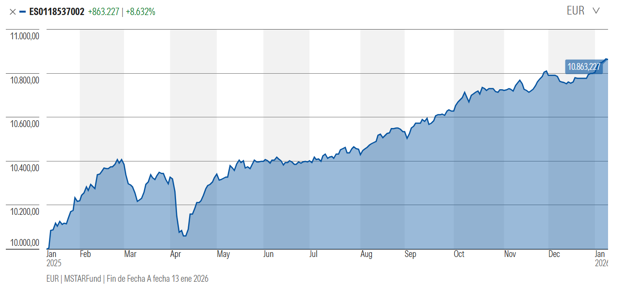 No sigue índices ni mantiene una cartera tradicional por países o sectores. Combina renta fija, derivados y liquidez con ajustes tácticos para proteger el capital. Sus gastos rondan el 0,9% anual (más comisión de éxito) y en 2025 obtuvo cerca de un +3%.