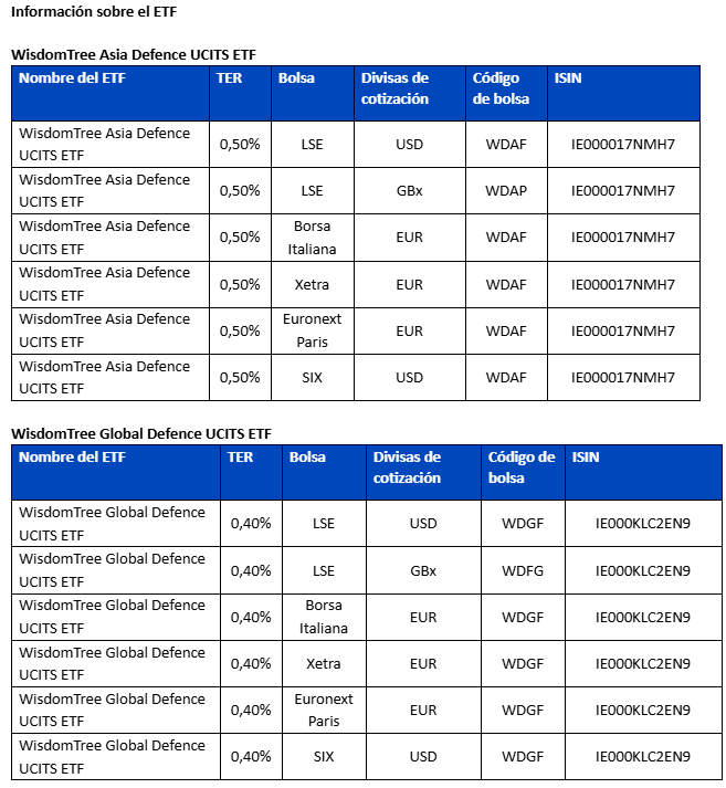 Alexis Marinof, CEO, Europe, WisdomTree, añadió: "WisdomTree ha construido una sólida reputación en ofrecer ETFs temáticos diferenciados respaldados por su propia investigación y experiencia en el diseño de índices. Añadir Global Defence y Asia Defence refuerza nuestra oferta de defensa y ofrece a los inversores nuevas formas de acceder a una temática que está cobrando cada vez más importancia en las carteras. Mientras persisten las tensiones geopolíticas y los gobiernos dan prioridad a la seguridad y la resiliencia, la defensa sigue siendo un poderoso ejemplo de cómo las megatendencias impulsadas por las políticas pueden dar forma a las oportunidades de inversión a largo plazo".